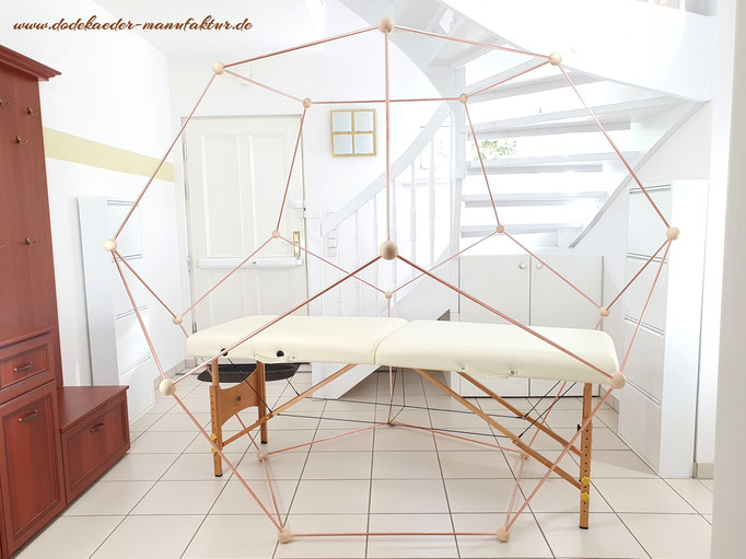 Aufgrund der Nachfrage bieten wir jetzt auch das Dodekaeder aus Kupfer für den Therapieeinsatz an. Diese begehbare Variante ist besonders geräumig, so dass auch eine Therapie-/Massageliege darin Platz hat. Bitte beachten Sie den Durchmesser 240 cm beim Ausmessen der Stellfläche.